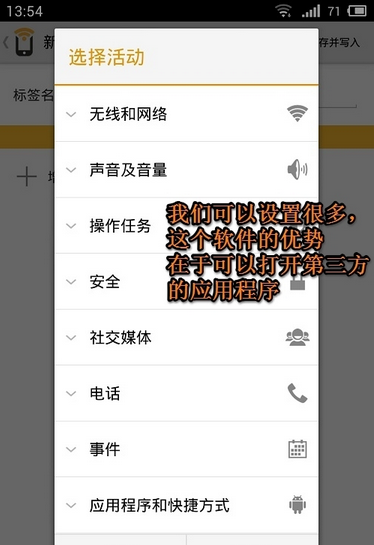 我們除了控制手機的基本功能外,我們還可以控制某些應用程序的開啟,或者發短信給某個人,打某個人的電話。注意,魅族MX3自帶的NFC功能還無法開啟第三方應用程序,需要其他軟件的支持。